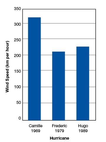 Hurricanes are huge storms that form over a warm ocean. The center of a hurricane is the calmest region and is called the "eye." The strongest winds and heaviest rains are in an areacalled the "eye wall." The graph at the left represents the top wind speeds in the eye wall of three hurricanes that hit the United States.