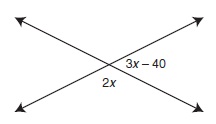 Note that the figure is not drawn to scale, so do not rely on the diagram to calculate the answer. Since the angles are adjacent and formed by two intersecting lines, they are also supplementary. Combine the two angles and set the sum equal to 180.2x + 3x – 40 = 180. Combine like terms and add 40 to both sides. 5x – 40 + 40 = 180 + 40. 5x = 220. Divide both sides by 5 to get x = 44. Then 2x = 88 and 3x – 40 = 92. The smaller angle is 88.