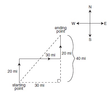 The distance between the starting point and the final destination is a diagonal line. This line is the hypotenuse of a right triangle that has one leg of 40 and the other measuring 30. Use the Pythagorean theorem: a2 + b2 = c2. Recall, however, that this is a multiple of the most common Pythagorean triple (3, 4, 5) — namely, 30, 40, 50. The distance is 50 miles.