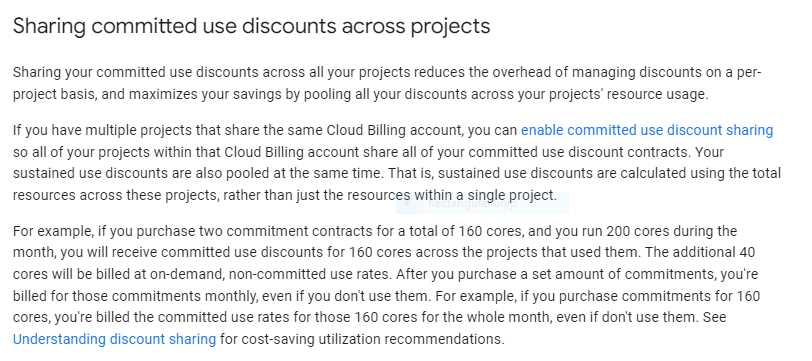 Sharing your committed use discounts across all your projects reduces the overhead of managing discounts on a per-project basis, and maximizes your savings by pooling all your discounts across your projects' resource usage. If you have multiple projects that share the same Cloud Billing account, you can enable committed use discount sharing so all of your projects within that Cloud Billing account share all of your committed use discount contracts. Your sustained use discounts are also pooled at the same time. That is, sustained use discounts are calculated using the total resources across these projects, rather than just the resources within a single project.