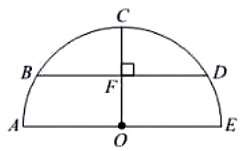 Since CF = OF, point F is the midpoint of CO. This means BD lies symmetrically within the semicircle. The exact length of BD is not explicitly defined, but it depends on the radius r of the semicircle and how high above O the segment BD is placed. The proportion of BD relative to AE could change based on the given radius and specific distances. Since the exact measurement of BD is unknown and no direct numerical comparison is provided, we cannot definitively determine the relationship between the two quantities.
