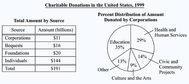 If the total amount donated by corporations had been divided evenly among the 4 categories -- education, health and human services, civic and community projects, and culture and the arts -- how much less would have been donated by corporations to education, in billions?