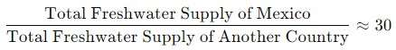 100 million × 2.5 thousand cubic meter = 250 million cubic meters Next, we need to find the country whose total freshwater supply is approximately 30 times smaller than Mexico's.