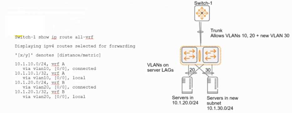 Adding a route with this command: ip route 10.1.20.0/24 vlan20 vrf A is not part of a valid setup for meeting these requirements. This command would add a static route for 10.1.20.0/24 in VRF A, but it would not be able to reach VLAN 20 on Switch-2 because Switch-2 does not have a VLAN interface for VLAN 20 in VRF A. To make the services in VLAN 30 available to devices in 10.1.20.0/24 in VRF B, you need to use inter-VRF routing or route leaking between VRF A and VRF B on Switch-11.