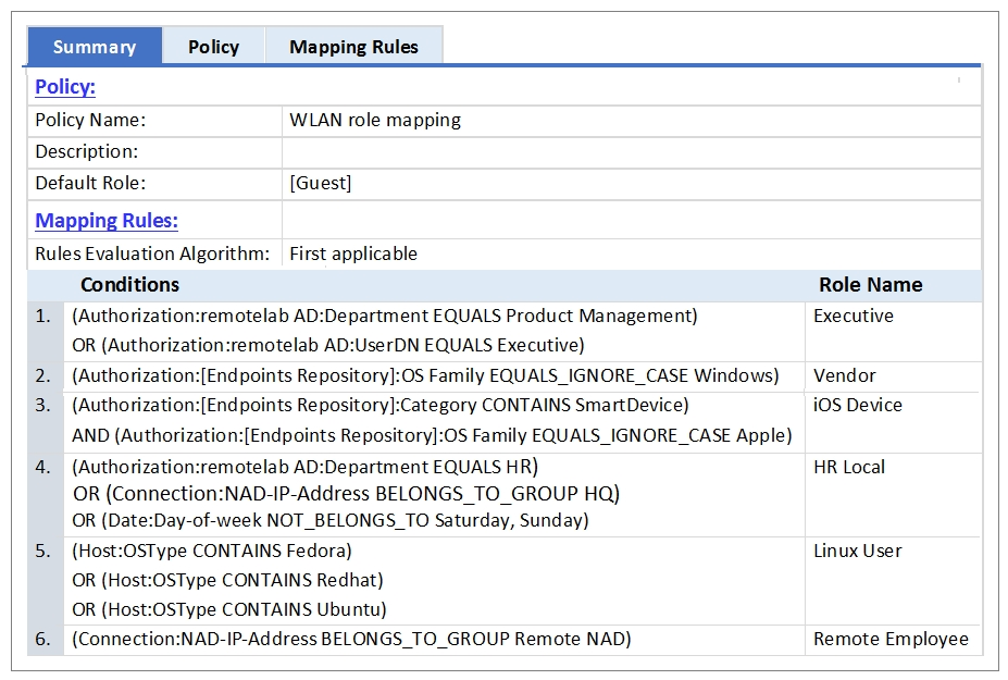 http://www.arubanetworks.com/techdocs/ClearPass/Aruba_CPPMOnlineHelp/Content/CPPM_User Guide/identity/RoleMappingPolicies.html