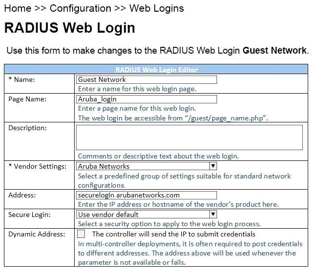 http://www.arubanetworks.com/techdocs/ClearPass/CPGuest_UG_HTML_6.5/Content/Configuratio n/CreateEditWebLogin.htm