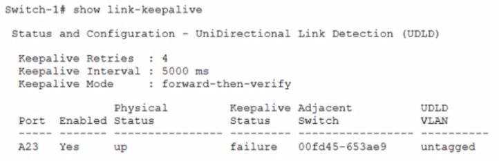 Switch-1 and Switch-2 connect on interface A23. The switches experience a connectivity issue. The network administrator sees that both switches show this interface as up. The administrator sees the output shown in the exhibit on Switch-1.