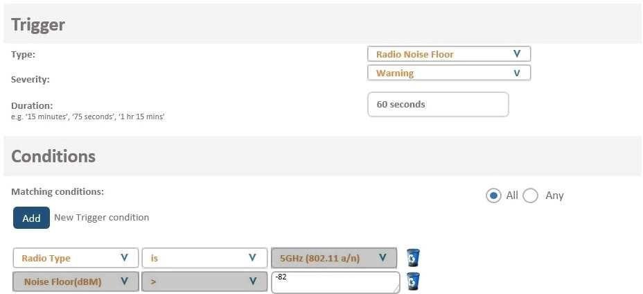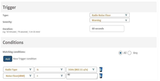 A network administrator wants to receive a warning level alarm every time the noise floor rises above -82 dBm on any of the AP radios.
