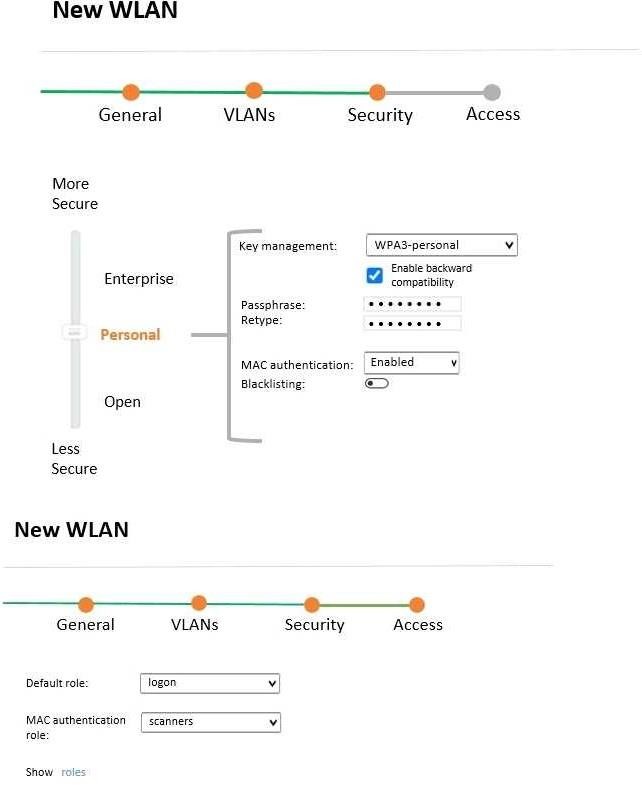 A company acquires ten barcode scanners to run inventory tasks. These WiFi devices support WPA2 - PSK security only. The network administrator deploys a WLAN named scanners using the configuration shown in the exhibit.