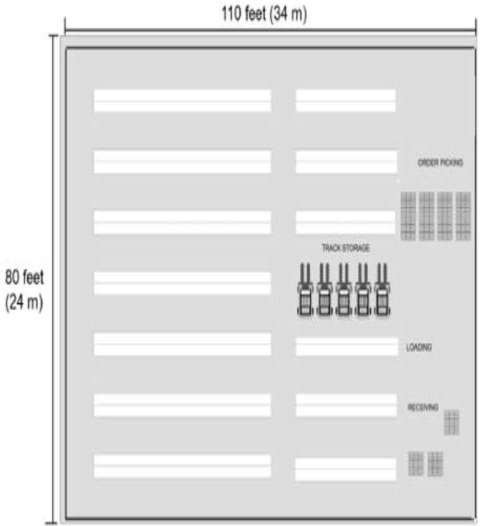 This warehouse has the dimensions shown in the exhibit. The warehouse is 20 feet (6 m) high up to a steel railing on the celling. The shelves are about 16 feet (5m) high, and they hold large containers filled with fluid and metal equipment.