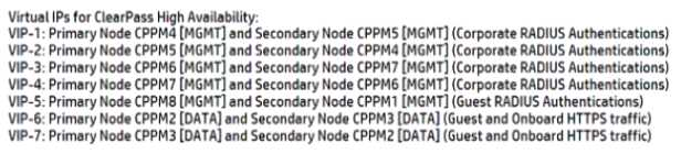 You have designed a ClearPass solution for an Information Technology Business Park with 50,377 concurrent sessions including the visitors. The deployment includes eight ClearPass servers handling RADIUS authentication. Guest Self-Registration. Onboard and OnGuard. CPPM1 is acting as Publisher. CPPM2 to CPPM8 are added as subscriber nodes CPPM4 is the designated Standby Publisher. Servers CPPM2 and CPPM3 will be handling the Guest and Onboard HTTPS traffic. On a few devices, Corporate users will perform username and password based authentication with Active Directory accounts and on few devices, they will be using private CA signed TLS certificates to do the authentication The customer has three Active Directories (AD1, AD2 and A03) part of Multi-Domain Forest. To provide authentication redundancy, the customer has configured multiple Virtual IP settings between ClearPass servers in a cluster.