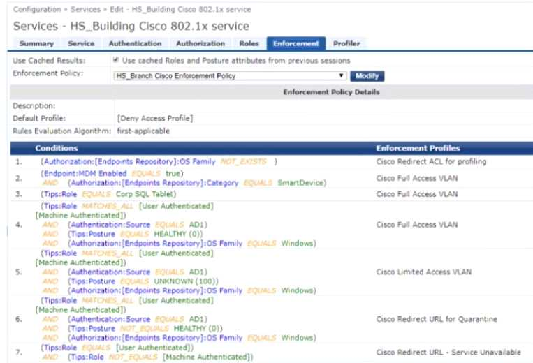 2. In the HS_Building 802.1X service, remove the service rule condition with Aruba controller location name and leave it in same position