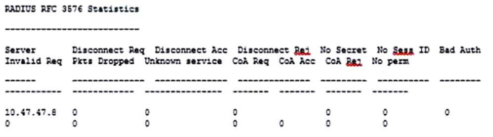 But when CPPM sends CoA requests to the MC, they are not working. This exhibit shows the RFC 3576 server statistics on the MC: