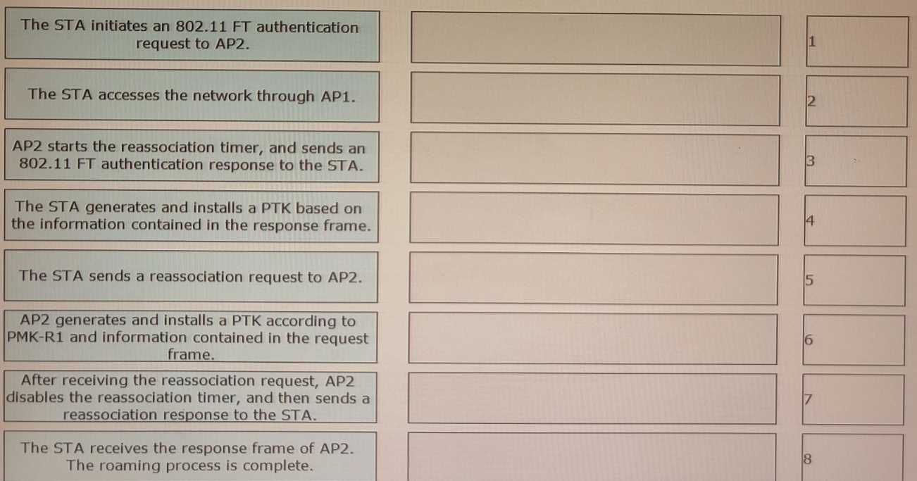 802. 11r fast roaming (over-the-air) is enabled on the WLAN shown in the figure. A STA roams from AP1 to AP2. Sort the steps in chronological order during the 802.11r fast roaming process between WACs.