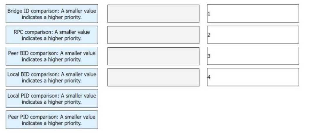 Peer BID Comparison: If there is a tie in the Root Path Cost, the Peer BID is compared. A smaller Peer BID indicates a higher priority. This step ensures that if two routers have the same RPC, the one with the lower Peer Bridge ID wins.