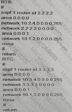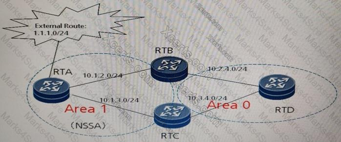 As shown in the figure, external route 1.1.1.0/24 is imported to RTA that is located in the NSSA area RTD is a backbone area router. RTB and RTC are both area border router (ABRs). OSPF configuration are as follows.