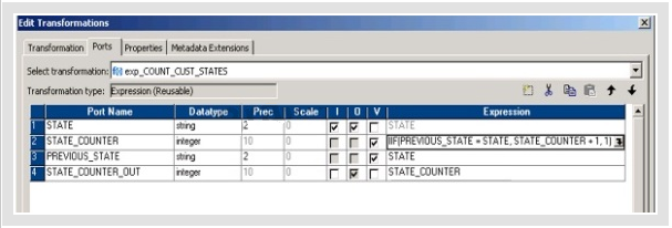 In the Expression transformation graphic below, what is the value of the PREVIOUS_STATE port for row 2, given that the value for the STATE port was 'CA' for row 1?