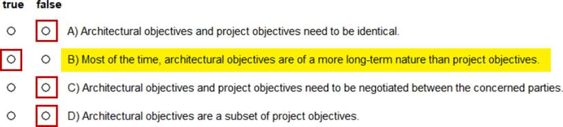 Which statements with regard to project objectives and architectural objectives are true and which are false? (Assign all answers.)