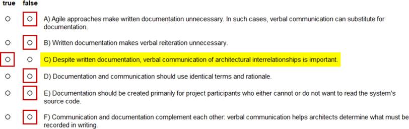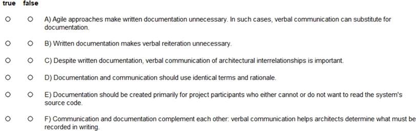 How are written documentation and verbal communication of software architectures related? Please mark the following statements as true or false. (Assign all answers.)