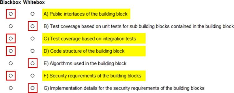 Which characteristics of a building block are only visible in the whitebox view, and for which characteristics does the blackbox view suffice? (Assign all answers.)