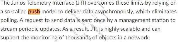 What is an advantage of the Junos Telemetry Interface (JTI) over SNMP?