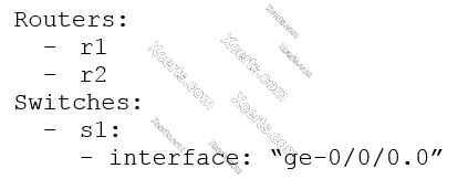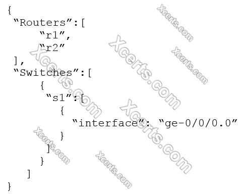 2. {“routers”:[“r1”,“r2”],“switches”:[{“s1”:[{“interface”:“ge-0/0/0.0”}]}]}