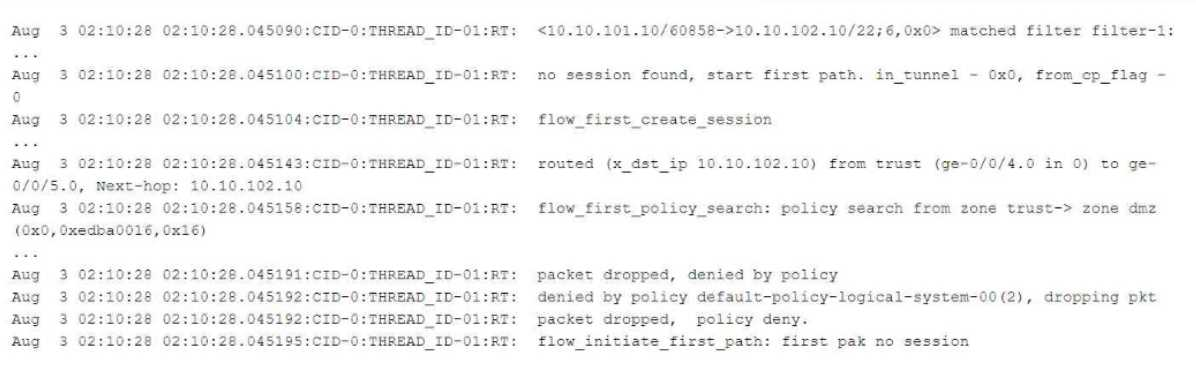 The log message clearly states that the packet was dropped by the default security policy (default- policy-logical-system-00). In Junos, when a session is attempted between two zones and no explicit policy exists to allow the traffic, the default policy is to deny the traffic. This is a common behavior in Junos OS when a security policy does not explicitly allow traffic between zones. Explanation of Answer D (Requires traceoptions flag of basic-datapath):