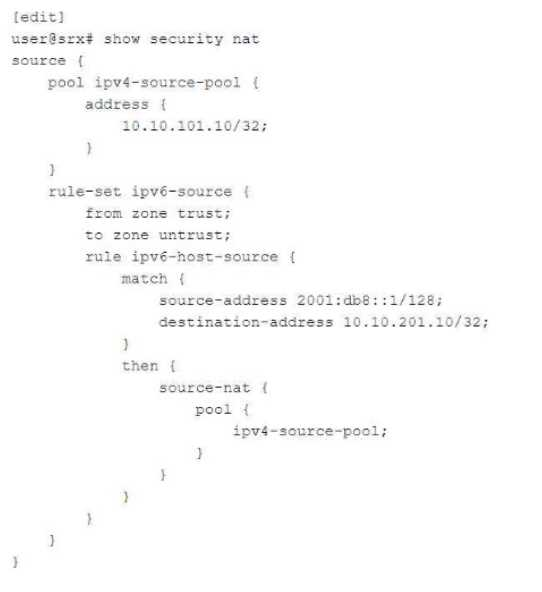You are configuring NAT64 on your SRX Series device. You have committed the configuration shown in the exhibit. Unfortunately, the communication with the 10.10.201.10 server is not working. You have verified that the interfaces, security zones, and security policies are all correctly configured.