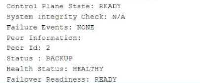 The exhibit describes a Chassis Cluster configuration with high availability (HA) settings. The key information is related to Service Redundancy Group 1 (SRG1) and its failover behavior between the two peers.