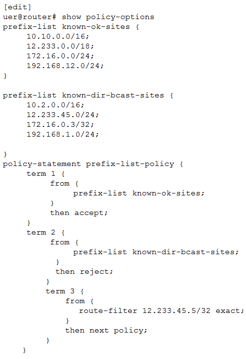 The policy shown in the exhibit is applied as an export policy to your BGP neighborship. Which action will be taken for route 12.233.45.5?