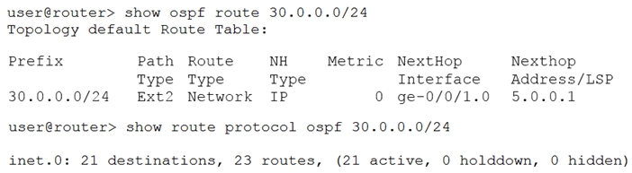 You notice an inconsistency between the routing table and the OSPF database, as shown in the exhibit.