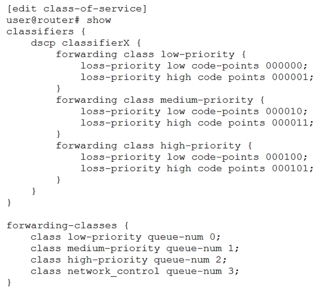 You manage an MX Series device which includes the configuration shown in the exhibit. Traffic marked with DSCP 000011 is entering the ge-1/0/4 interface at 102 Mbps. The traffic exits the device on the ge-1/0/5 interface. No other traffic is transiting the router.