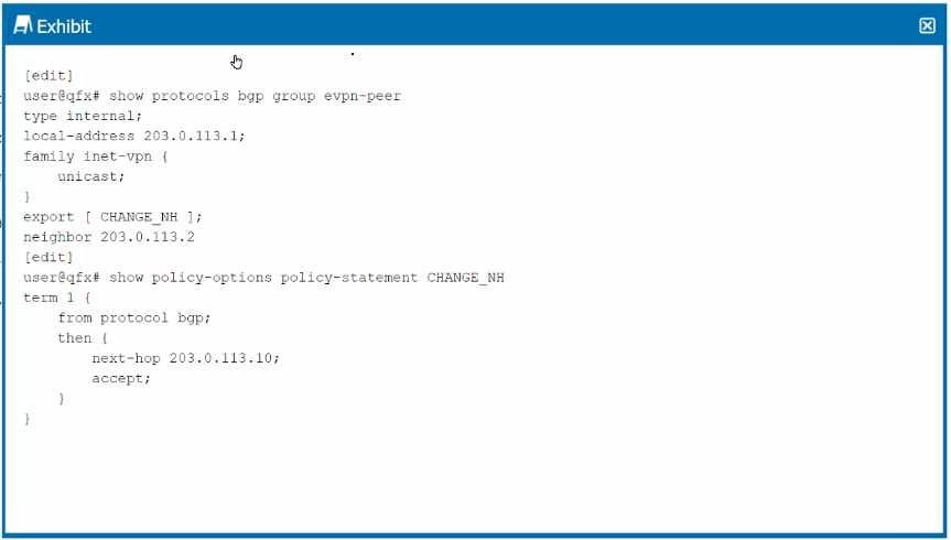 The policy CHANGE_NH is correctly configured to change the next hop to 203.0.113.10 for the matching routes. However, the next hop remains unchanged when advertising EVPN routes to the peer 203.0.113.2.