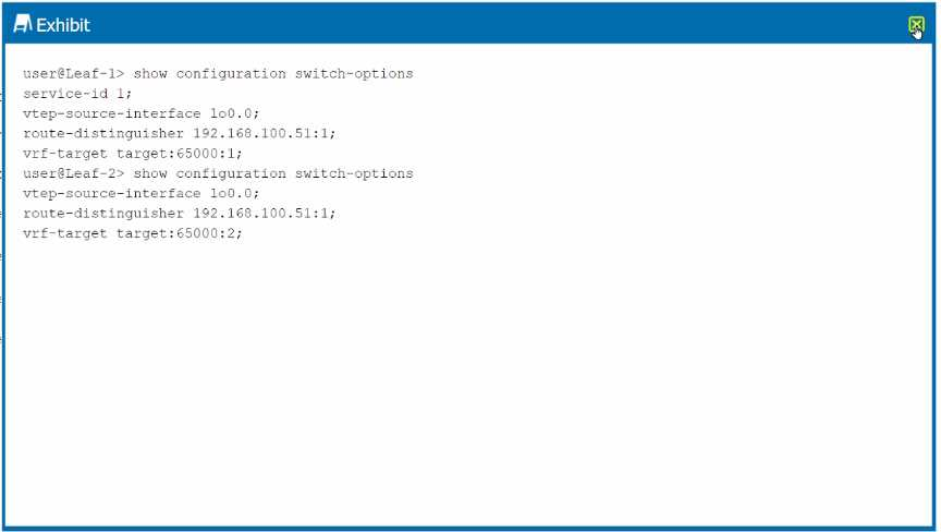 Service-ID: Leaf-1 has service-id 1 configured, while Leaf-2 does not have this parameter. For consistency and proper operation, the service-id should be the same across both leaf devices. VRF Target: Leaf-1 is configured with vrf-target target:65000:1, while Leaf-2 is configured with vrf- target target:65000:2. To allow proper VRF import/export between the two leafs, these should match.