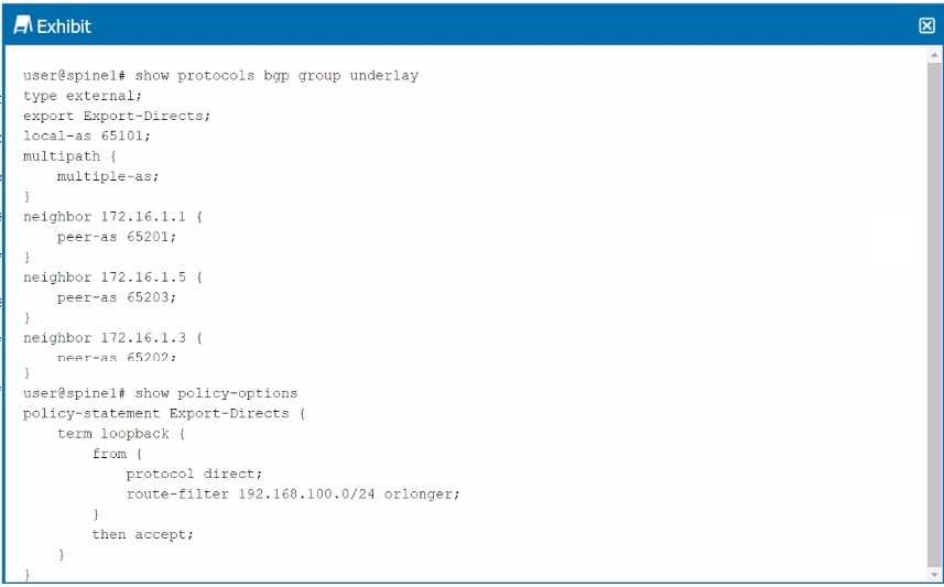 Referring to the exhibit, the spinel device has an underlay BGP group that is configured to peer with its neighbors' directly connected interfaces.