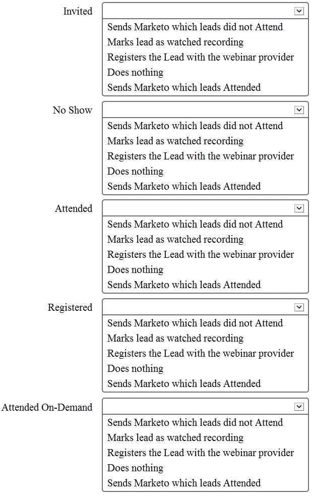 Match each Webinar Program Status with its effect on the webinar provider or Marketo. Answer options may be used more than once or not at all.
