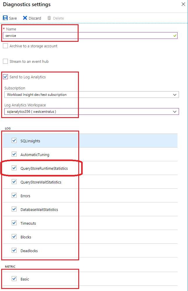 7. For the standard, event-based monitoring experience, select the following check boxes for database diagnostics log telemetry: QueryStoreRuntimeStatistics