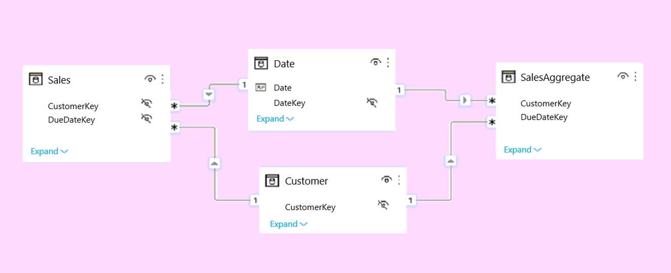 You need to combine the Customer tables into a single table. The solution must minimize the size of the data model and support scheduled refresh in powerbi.com.