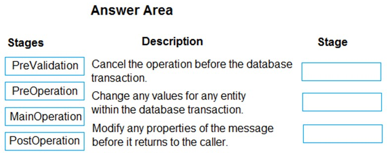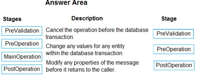 This provides an opportunity to include logic to cancel the operation before the database transaction. Box 2: PreOperation