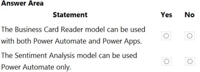 You are planning to use the Business Card Reader and Sentiment Analysis prebuilt AI models to build solutions.