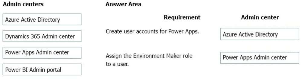 Which admin centers should you use? To answer, drag the appropriate admin centers to the correct requirements. Each admin center may be used once, more than once, or not at all. You may need to drag the split bar between panes or scroll to view content.
