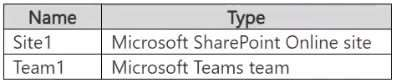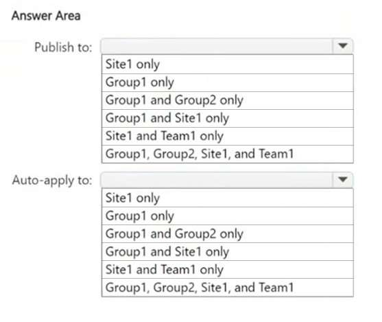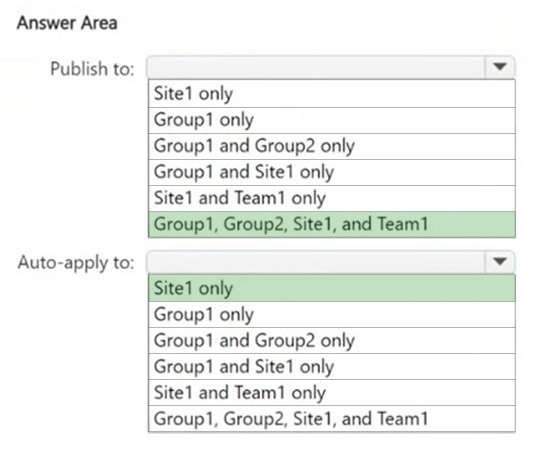 However, labels cannot be auto-applied to Microsoft 365 groups or Teams directly because labels are applied to files and emails, not to groups or Teams as entities. Since Site1 (a SharePoint Online site) supports auto- apply, it is the correct option.