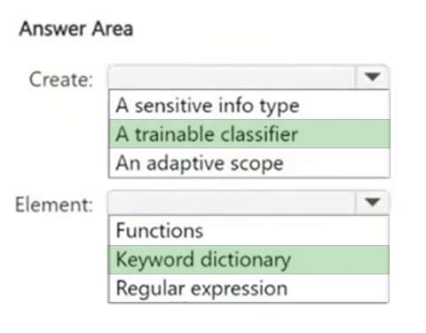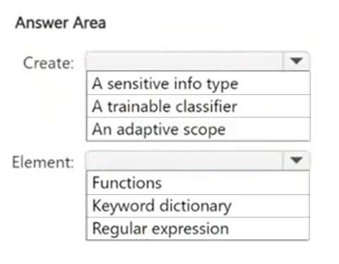 Since Customer.csv contains a list of names, the best element to use is a keyword dictionary. A keyword dictionary allows you to upload a list of predefined terms (such as customer names) to classify documents based on their presence. Regular expressions are used for pattern-based detection (e.g., credit card numbers, serial numbers), which is not needed here. Functions are used for predefined sensitive data detection (e.g., checksum validation for credit card numbers), which does not apply in this case.