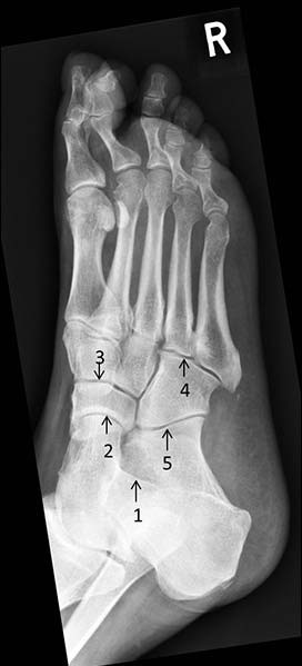 A 55-year-old man with type 2 diabetes mellitus presented with foot swelling and discomfort. He had a peripheral sensory neuropathy attributed to diabetes mellitus. A midfoot Charcot’s arthropathy was suspected, and a plain X-ray was arranged (see image).