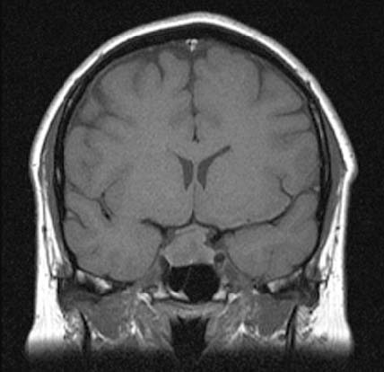 A 32-year-old woman presented to the outpatient clinic with a 1-year history of amenorrhoea that began after stopping her oral contraceptive pill. She had previously had two successful pregnancies and was otherwise well. Examination was normal and no visual field defect was present on testing to confrontation.