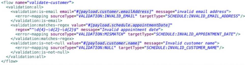 The validate-customer flow uses an until-successful scope to validate each field of the customer data. The until-successful scope executes its processors until they succeed or exhausts the maximum number of retries. If any processor fails, it raises an error and stops executing the remaining processors. Therefore, if only the email address is invalid, a VALIDATION.INVALID_EMAIL error is raised and the validation of appointment date and customer name is skipped.
