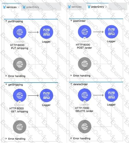 The two Mule configuration files belong to the same Mule project. Each HTTP Listener is configured with the same host string and the port number, path, and operation values are shown in the display names.