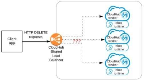 A Mule application has an HTTP Listener that accepts HTTP DELETE requests. This Mule application Is deployed to three CloudHub workers under the control of the CloudHub Shared Load Balancer.