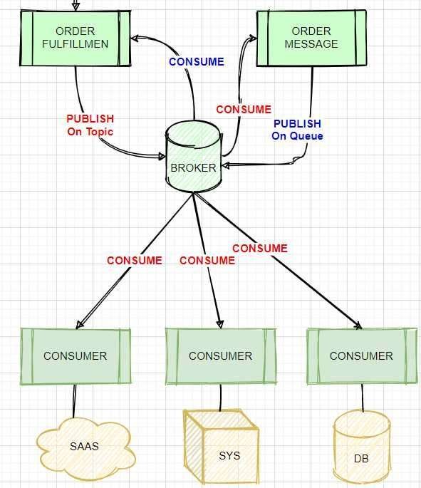 Best choice in this scenario is: "Order messages are sent to a JMS queue. OrderFulfilled messages are sent to a JMS topic. Both microservices interact with the same JMS provider (message broker) instance, which must therefore scale to support the load of both microservices" Tried to depict scenario in diagram: