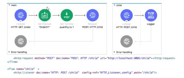 Refer to the exhibit.The main flow contains a Flow Reference for the child flow. What values are accessible in the child flow after a web client submits a request to http://localhost:8081/order? color=red?